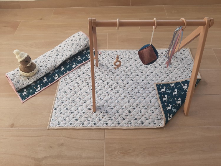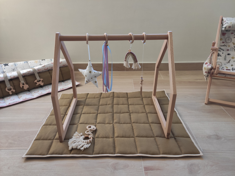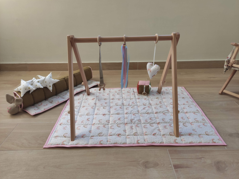 Συνδυάστε το γυμναστήριο με ένα απαλό στρωματάκι από κάτω. Εναλλακτικά μπορείτε να βάλετε ένα χαλάκι ή μια φωλιά για να είναι ξαπλωμένο αναπαυτικά το μωράκι!