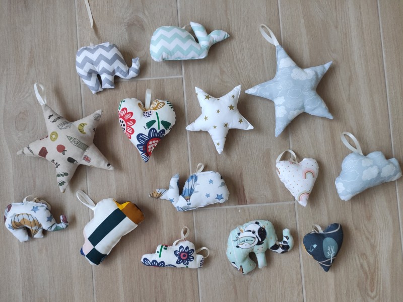 - Κρεμαστά υφασμάτινα μαξιλαράκια σε όμορφα σχέδια (αστεράκια, ελεφαντάκι, φάλαινα, καρδούλα κ.α.) που διεγείρουν τη φαντασία του μωρού (7€ το κάθε σχεδιάκι κρέμεται με κορδελίτσα πάνω σε ξύλινο κρίκο)