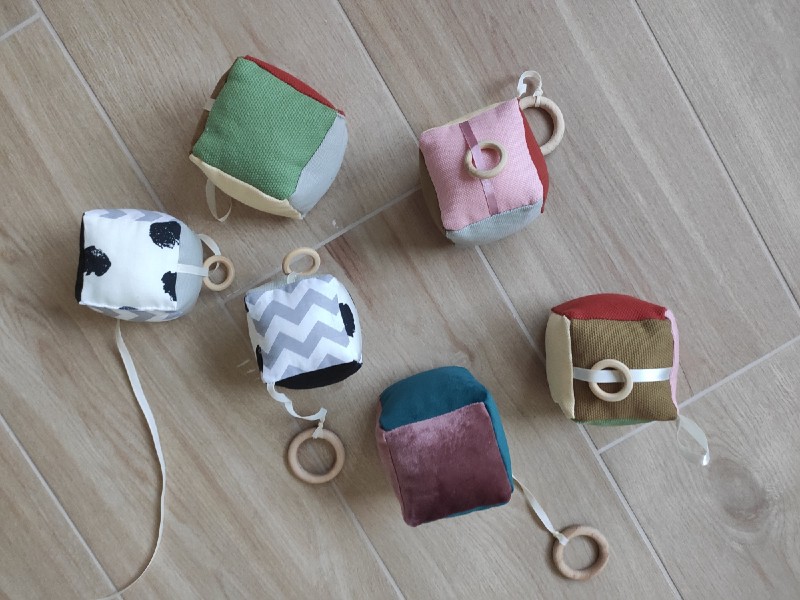 - Κύβος-μπαλίτσα με διαφορετικά χρώματα και υφές (8€ ο κάθε κύβος με ξύλινο κρικάκι)