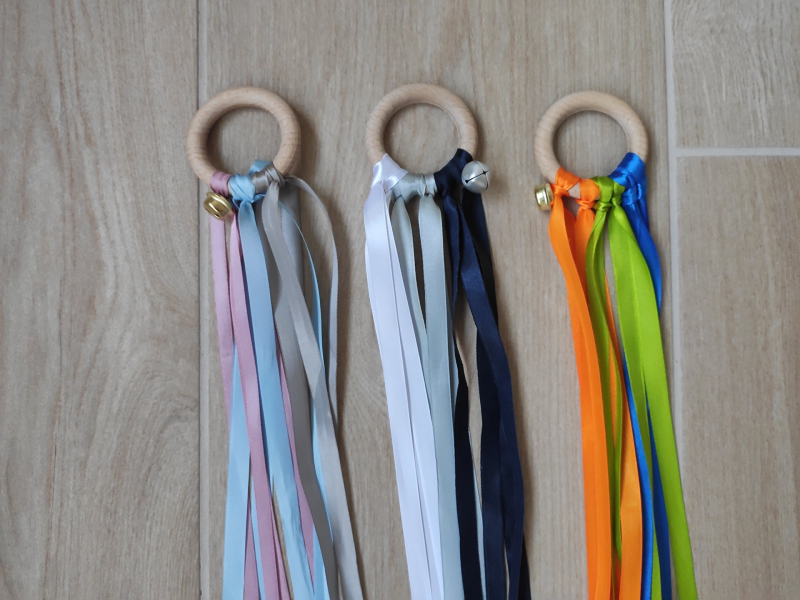 - Χρωματιστές κορδέλες που κουνιούνται με κουδουνάκια δίνοντας οπτιακουστικά ερεθίσματα και προκαλούν το μωρό να τις πιάσει και να τις κουνήσει (4€ ξύλινος κρίκος με χρωματιστές κορδέλες σε πολλούς συνδυασμούς με κουδουνάκι)